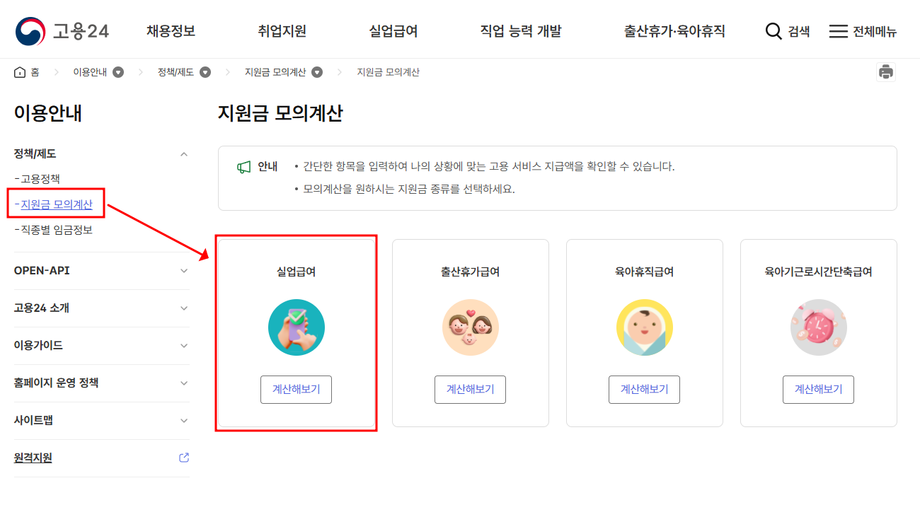 2️⃣ 전체 메뉴에서 지원금 모의계산 > 실업급여 모의계산 선택